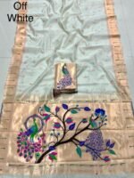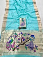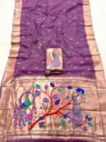 Experience elegance with our Pure Soft Organza Silk Saree, featuring a stunning contrast Paithani border and a rich zari weaving pallu that adds a regal touch to your look. Paired with a beautiful brocade blouse, this saree perfectly blends traditional craftsmanship with modern sophistication.