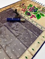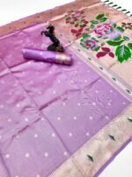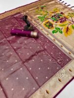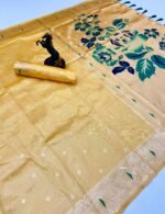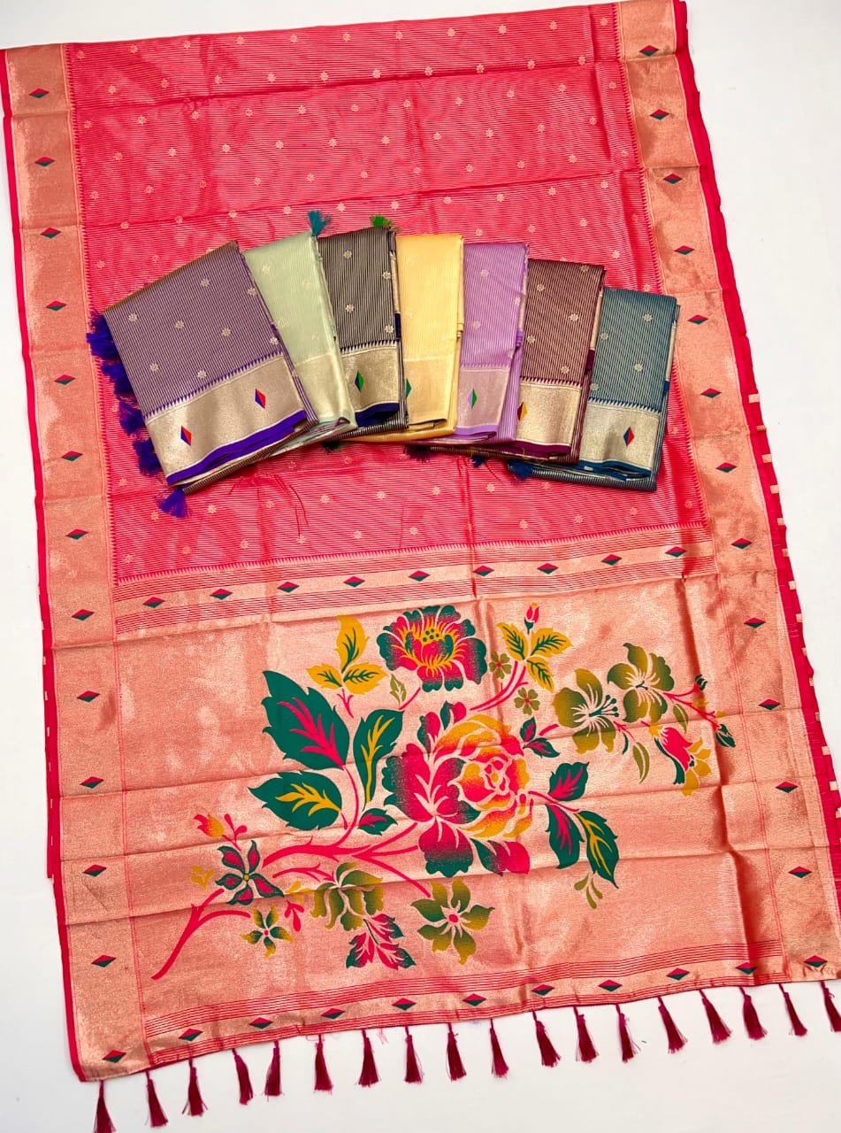 Discover pure elegance with our latest Pure Soft Tissue Silk Paithani Saree, exquisitely designed with 3 Muniya borders and heavy Mina Zari weaving. The rich, lustrous Paithani pallu showcases intricate artistry, making this saree a true statement of luxury and tradition.