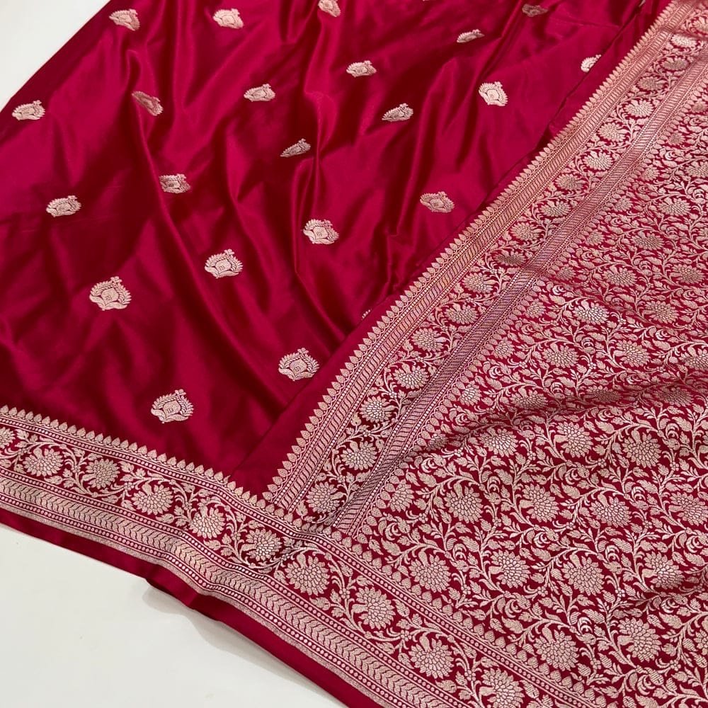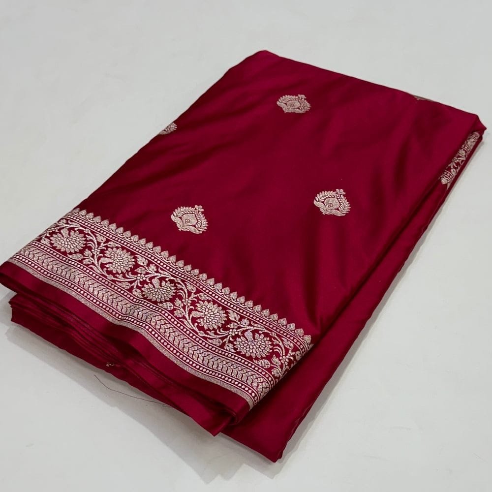 Experience royal elegance with our exquisite Mashru Katan Silk Saree, crafted straight from the heart of Banaras. This masterpiece showcases fine zari floral butta weaving and a heavy contrast zari border and pallu, reflecting the timeless artistry of Banarasi craftsmanship.